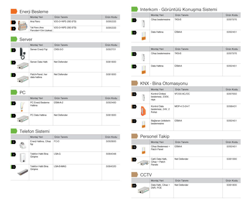 Korunması gereken sistemler: Enerji hattı (Ana Pano – Tali Pano), Elektrikle çalışan tüm cihazlar, Telefon hattı, Kablo veya SAT TV hattı, Data hattı, Server hattı, KNX-Bina otomasyon sistemi, Isıtma Sistemi, Interkom sistemi, Yangın İkaz Anons Sistemi, CCTV sistemi, Dış aydınlatma armatürleri korunmalıdır.